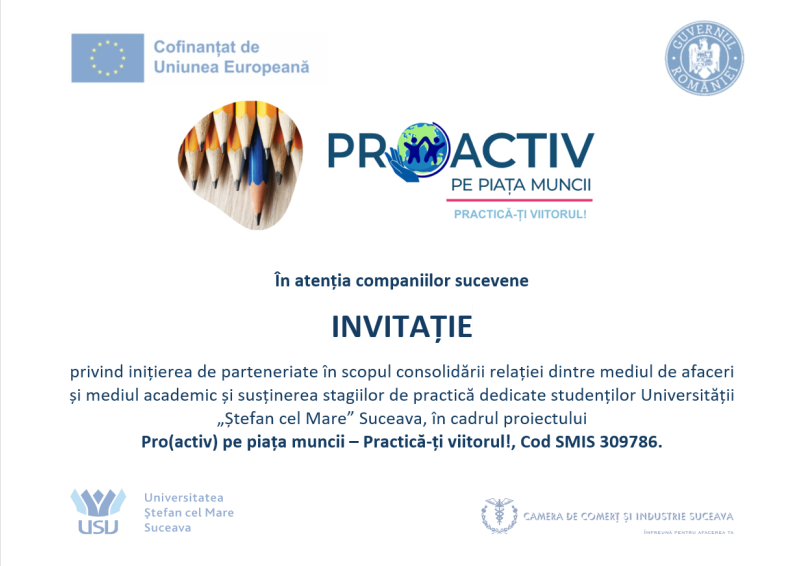 Camera de Comerț și Industrie Suceava, în parteneriat cu Universitatea „Ștefan cel Mare” Suceava, implementează în perioada 01.11.2024 – 31.10.2026, proiectul Pro(activ) pe piața muncii – Practică-ți viitorul! (cod SMIS 309786), având ca obiectiv principal consolidarea unui parteneriat durabil între universitate, mediul de afaceri și comunitatea locală prin programe de practică dedicate studenților, care vor beneficia de consiliere, formare antreprenorială durabilă și stagii de practică în companiile sucevene, pentru dezvoltarea competențelor profesionale și transversale.