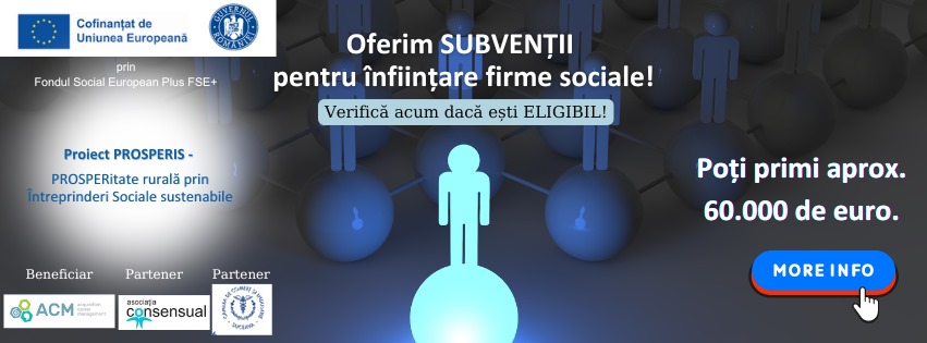 Camera de Comert si Industrie Suceava, in calitate de partener al proiectului Prosperis, Cod MySmis 309476, invita persoanele care vor sa obtina fonduri europene nerambursabile pentru infiintarea de intreprinderi sociale in mediul rural să completeze formularul de inscriere disponibil aici: https://docs.google.com/forms/